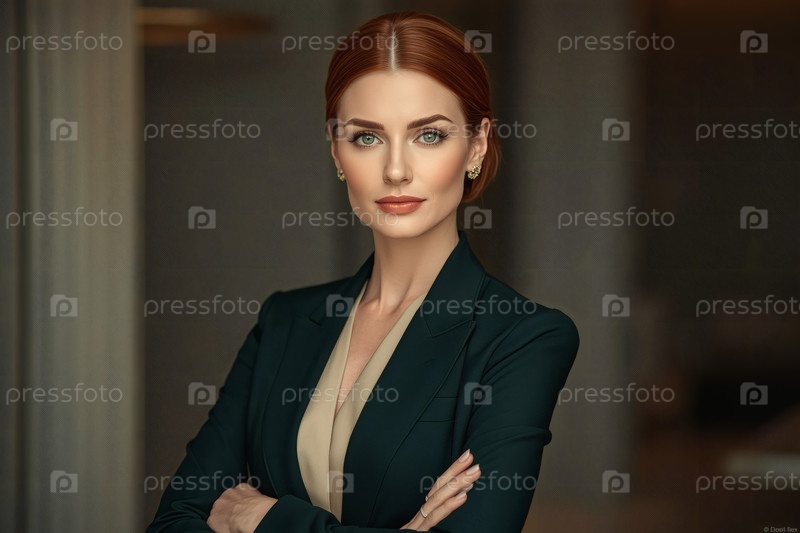 Элегантная бизнесвумен с рыжими волосами. Она носит обычный дорогой темно-зеленый блейзер или куртку. Она смотрит прямо в камеру, скрестив руки над грудью