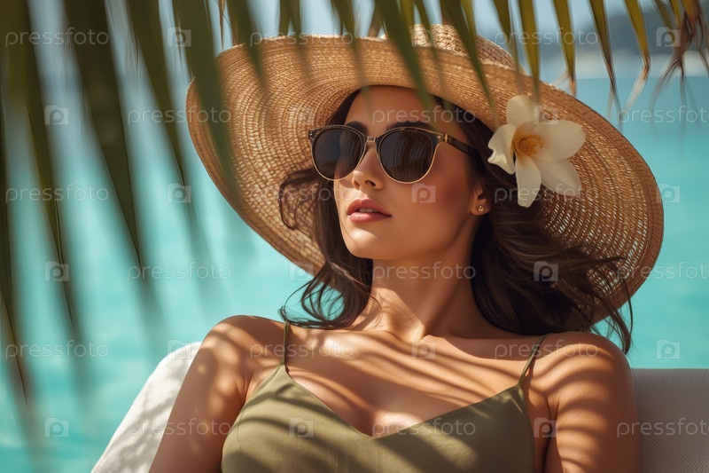 Элегантная, роскошная, красивая женщина на отдыхе, в широкополой соломенной шляпе и солнцезащитных очках, сидящая на пляжном шезлонге в солнечный день
