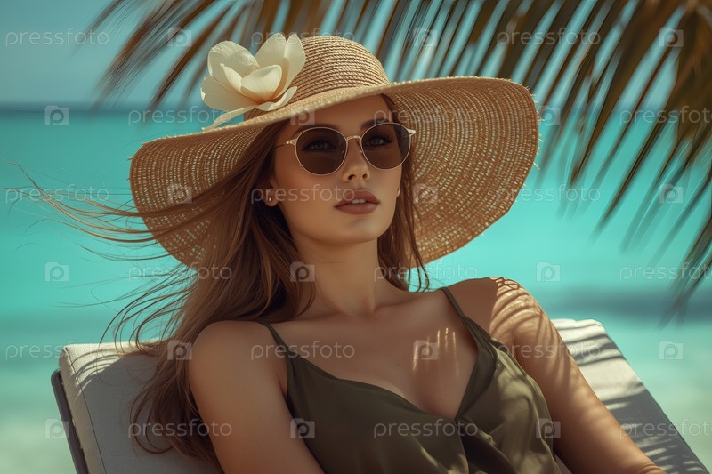Элегантная, роскошная, красивая женщина на отдыхе, в широкополой соломенной шляпе и солнцезащитных очках, сидящая на пляжном шезлонге в солнечный день