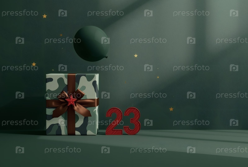 Концепция празднования Дня защитника Отечества 23 февраля. Подарочную камуфляжную коробку с праздничным атласным ленточным луком на зеленом фоне