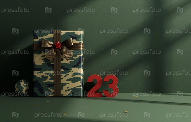 Концепция празднования Дня защитника Отечества 23 февраля. Подарочную камуфляжную коробку с праздничным атласным ленточным луком на зеленом фоне