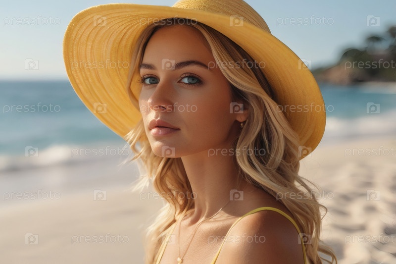 Женщина в отпуске, в купальнике и широкополой соломенной шляпе, сидит на пляже в солнечный день