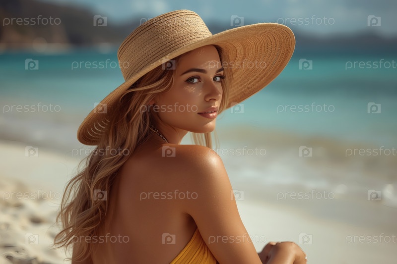 Элегантная, роскошная, красивая женщина на отдыхе, в купальнике и широкополой соломенной шляпе, потягивающая кокосовый коктейль в солнечный пляжный день