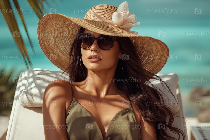 Элегантная, роскошная, красивая женщина на отдыхе, в широкополой соломенной шляпе и солнцезащитных очках, сидящая на пляжном шезлонге в солнечный день