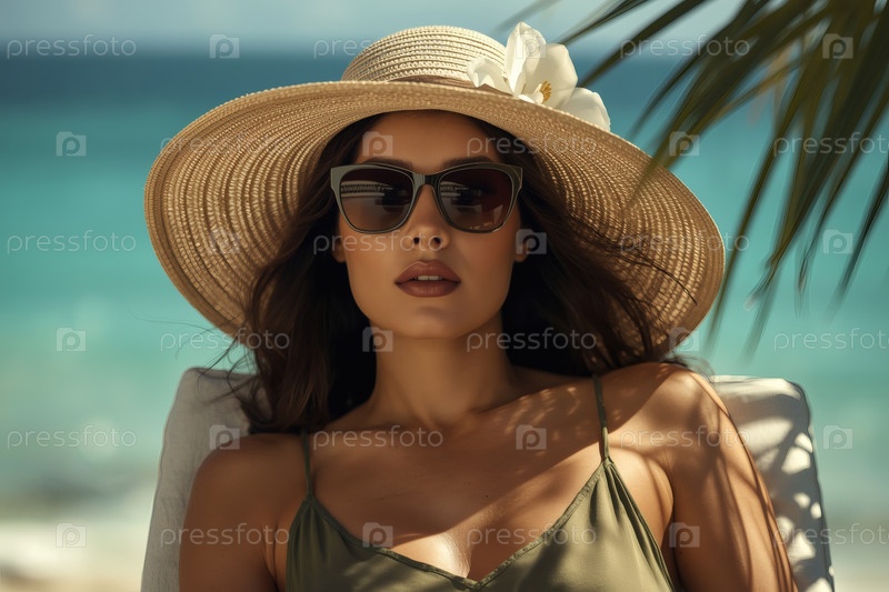 Элегантная, роскошная, красивая женщина на отдыхе, в широкополой соломенной шляпе и солнцезащитных очках, сидящая на пляжном шезлонге в солнечный день