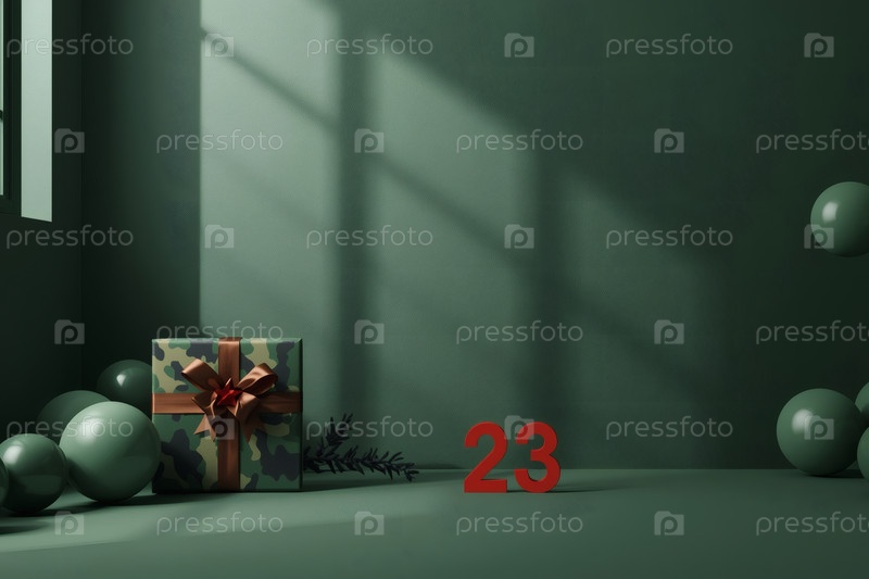 Концепция празднования Дня защитника Отечества 23 февраля. Подарочную камуфляжную коробку с праздничным атласным ленточным луком на зеленом фоне
