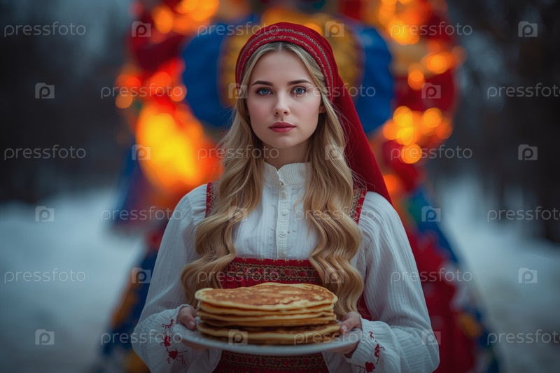 Знамя праздника Широкая Масленица. Девушка в традиционном сарафане с тарелкой блины на русском фестивале