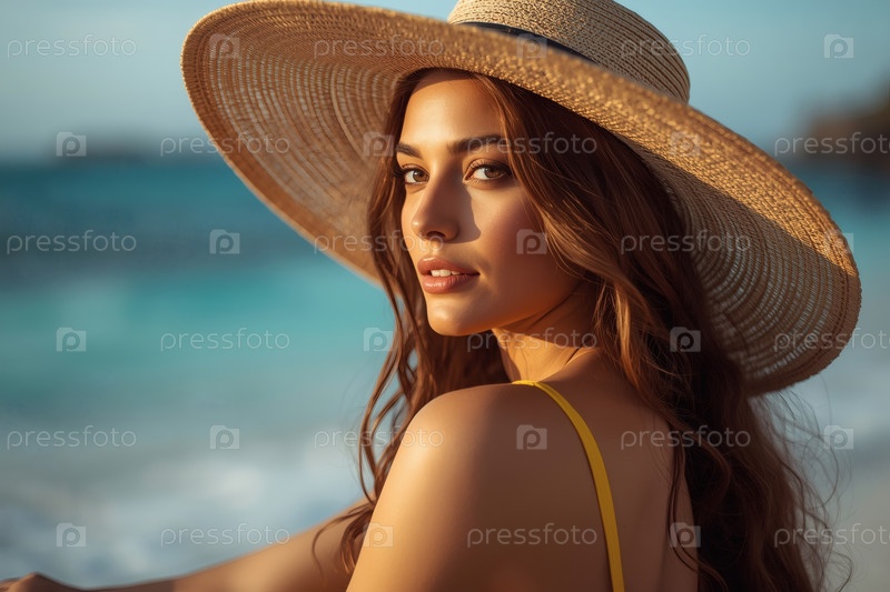 Элегантная, роскошная, красивая женщина на отдыхе, в купальнике и широкополой соломенной шляпе, потягивающая кокосовый коктейль в солнечный пляжный день