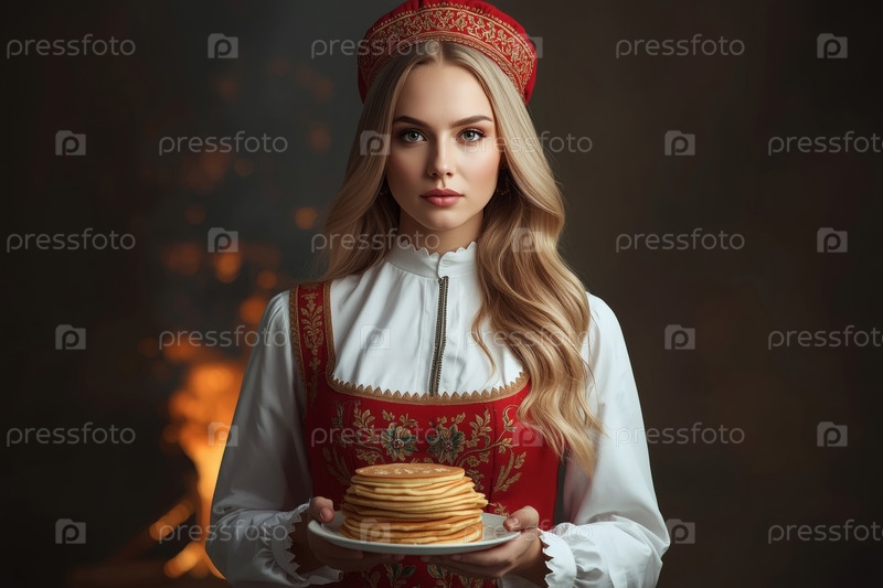 Знамя праздника Широкая Масленица. Девушка в традиционном сарафане с тарелкой блины на русском фестивале