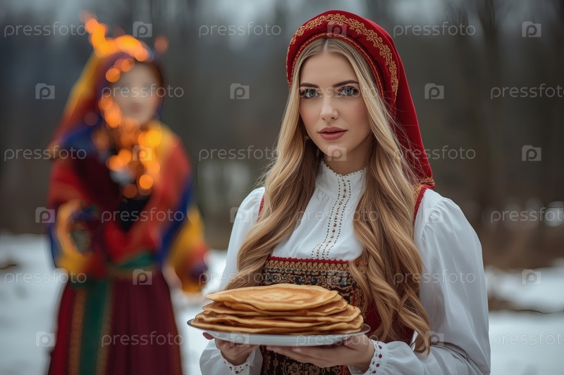 Знамя праздника Широкая Масленица. Девушка в традиционном сарафане с тарелкой блины на русском фестивале