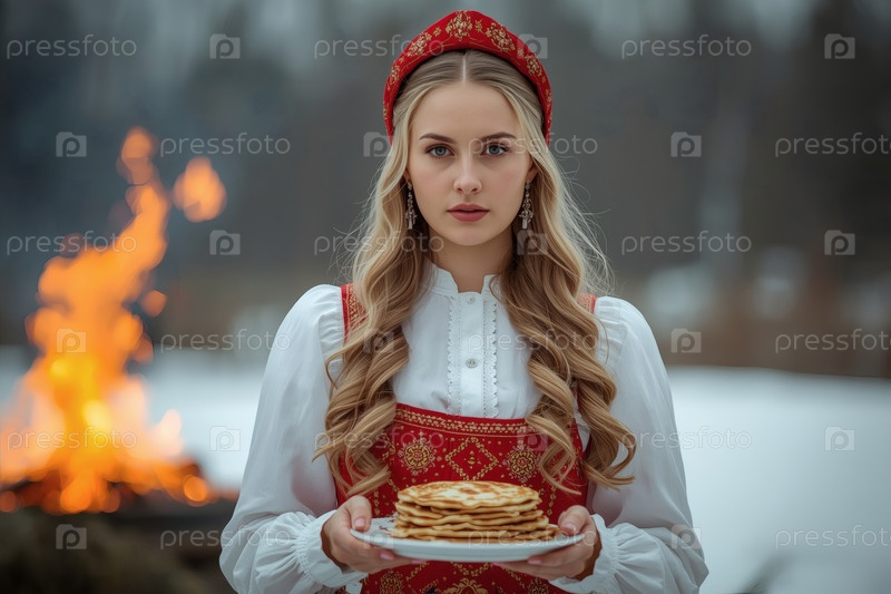 Знамя праздника Широкая Масленица. Девушка в традиционном сарафане с тарелкой блины на русском фестивале