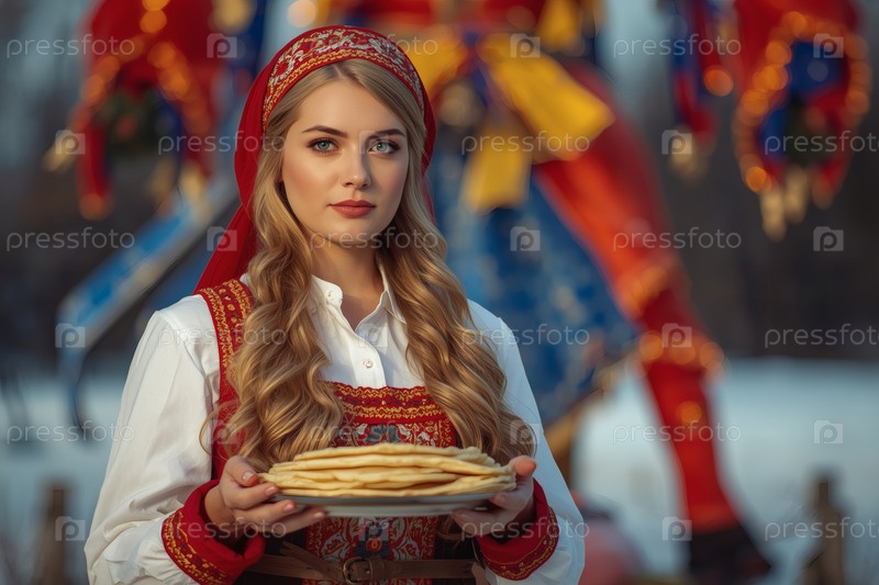 Знамя праздника Широкая Масленица. Девушка в традиционном сарафане с тарелкой блины на русском фестивале