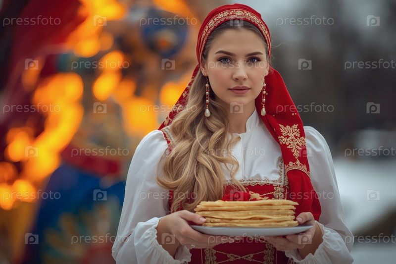 Знамя праздника Широкая Масленица. Девушка в традиционном сарафане с тарелкой блины на русском фестивале