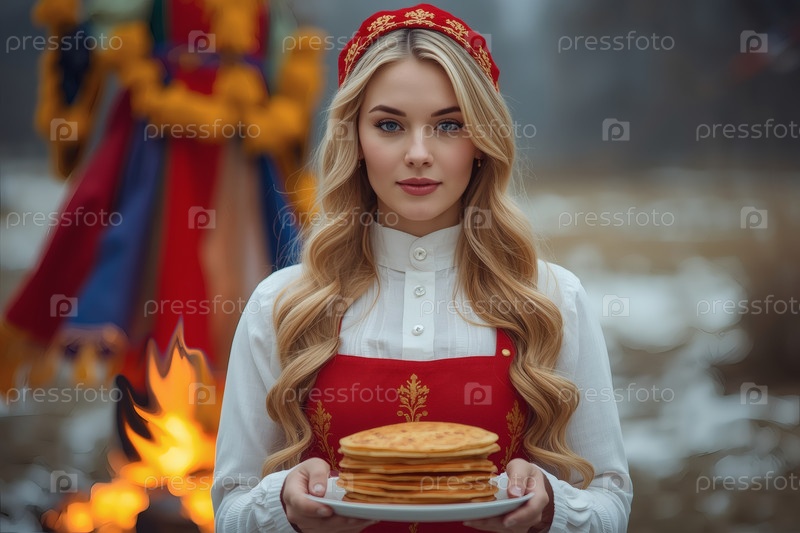 Знамя праздника Широкая Масленица. Девушка в традиционном сарафане с тарелкой блины на русском фестивале