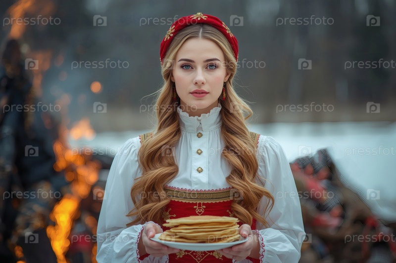 Знамя праздника Широкая Масленица. Девушка в традиционном сарафане с тарелкой блины на русском фестивале