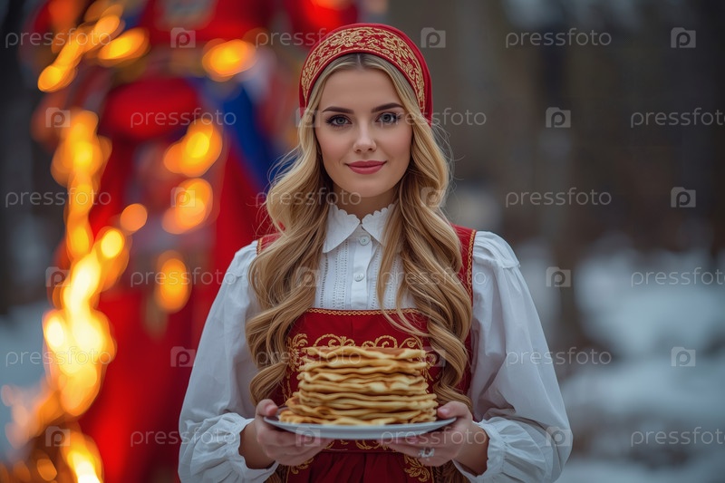 Знамя праздника Широкая Масленица. Девушка в традиционном сарафане с тарелкой блины на русском фестивале