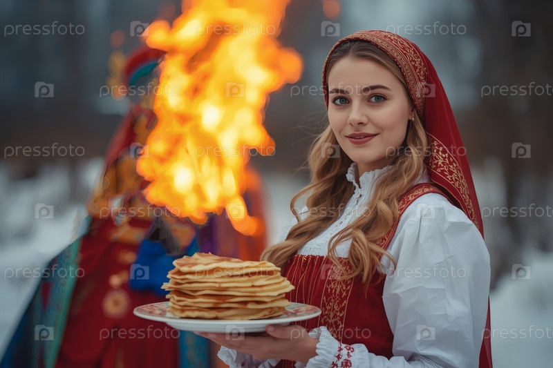 Знамя праздника Широкая Масленица. Девушка в традиционном сарафане с тарелкой блины на русском фестивале