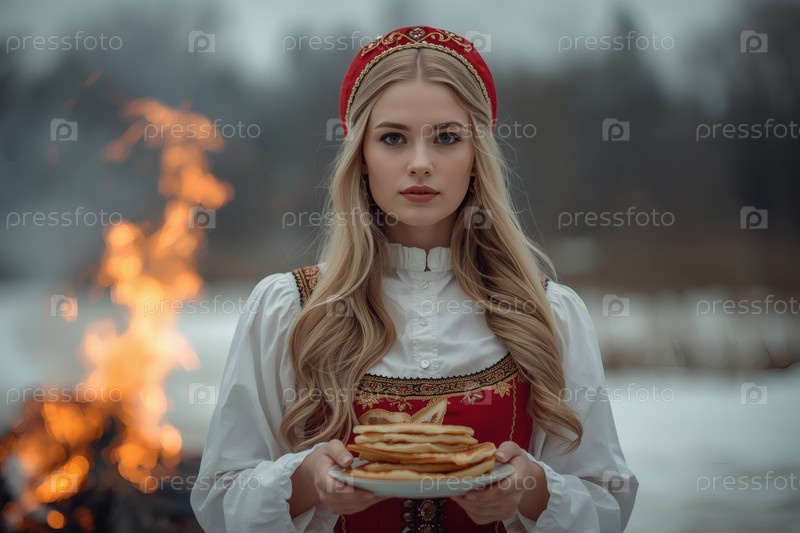 Знамя праздника Широкая Масленица. Девушка в традиционном сарафане с тарелкой блины на русском фестивале