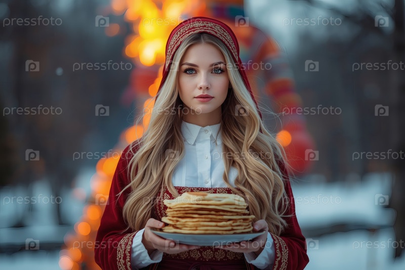 Знамя праздника Широкая Масленица. Девушка в традиционном сарафане с тарелкой блины на русском фестивале