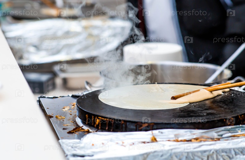 Готовить блинчики на открытом воздухе крупным планом с поднимающимся паром, который приурочен к приходу весны и празднику Масленицы