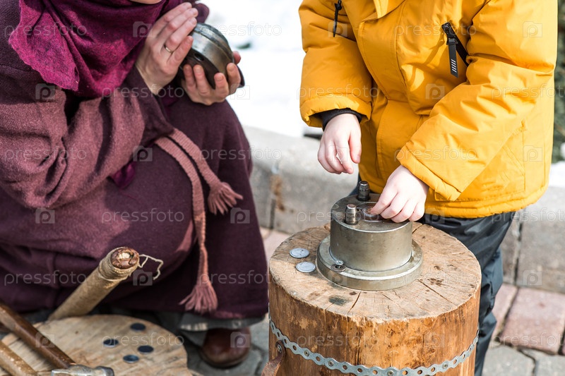 Отчеканка сувенирных монет на ярмарке в честь праздника Масленицы. Уличные развлечения для детей на мероприятии. Россия, Истра, 1 марта 2025 года