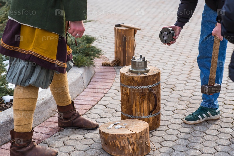 Отчеканка сувенирных монет на ярмарке в честь праздника Масленицы. Уличные развлечения для гостей мероприятия