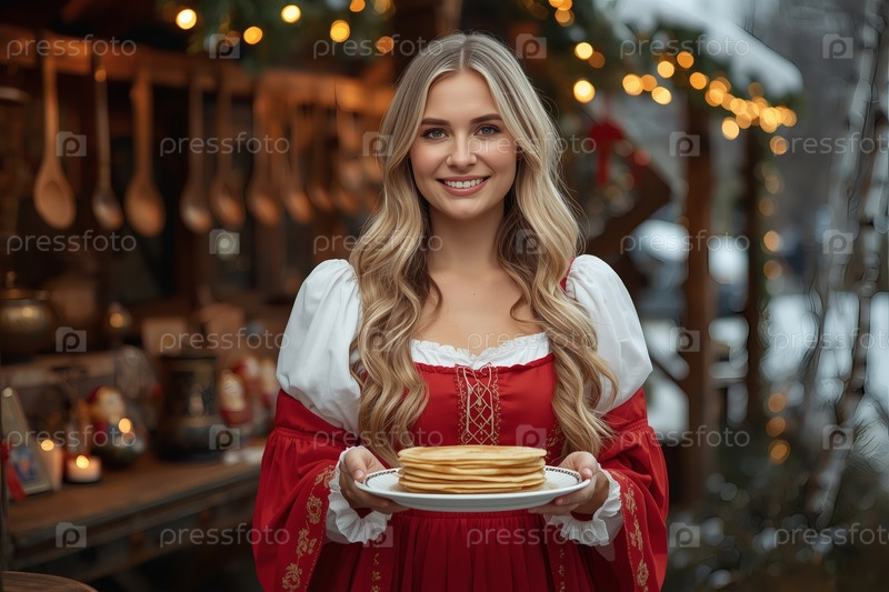 Знамя праздника Широкая Масленица. Красивая 30-летняя женщина в традиционном сарафане с шарфом на плечах и тарелкой блины на русской ярмарке