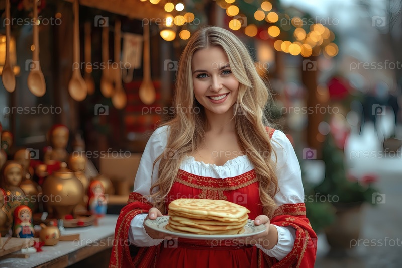 Знамя праздника Широкая Масленица. Красивая 30-летняя женщина в традиционном сарафане с шарфом на плечах и тарелкой блины на русской ярмарке