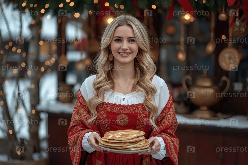 Знамя праздника Широкая Масленица. Красивая 30-летняя женщина в традиционном сарафане с шарфом на плечах и тарелкой блины на русской ярмарке