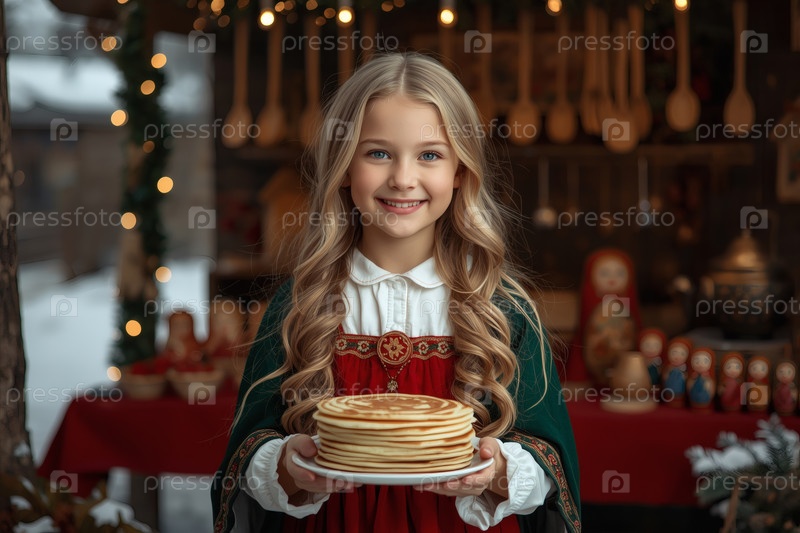 Знамя праздника Широкая Масленица. Красивая 6-летняя девочка в традиционном сарафане, с шарфом на плечах и тарелкой блины на русской ярмарке