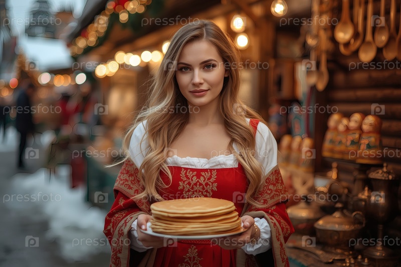 Знамя праздника Широкая Масленица. Красивая 30-летняя женщина в традиционном сарафане с шарфом на плечах и тарелкой блины на русской ярмарке