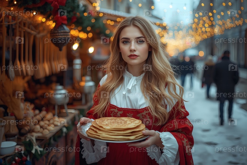 Знамя праздника Широкая Масленица. Красивая 30-летняя женщина в традиционном сарафане с шарфом на плечах и тарелкой блины на русской ярмарке