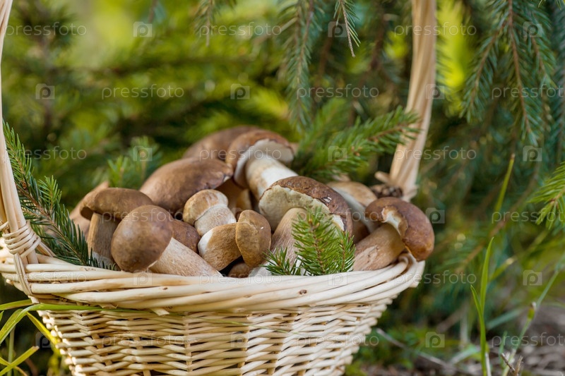 Благородный королевский гриб. Темно-белый или бронзовый болет. Болетус грибы в плетеной корзине в ельном лесу. Красивая текстура природного фона