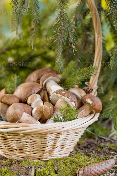 Благородный королевский гриб. Темно-белый или бронзовый болет. Болетус грибы в плетеной корзине в ельном лесу. Красивая текстура природного фона