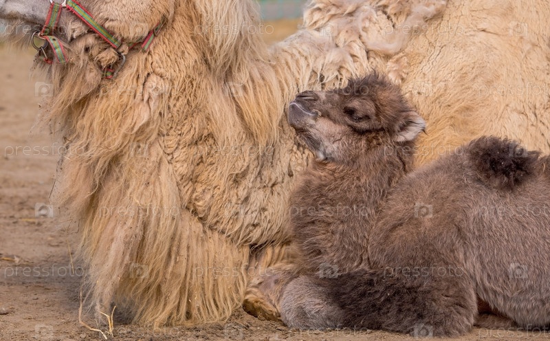 Зоопарк. Нежный портрет матери и верблюда, который только что родился. Материнская любовь к животным. Знамя