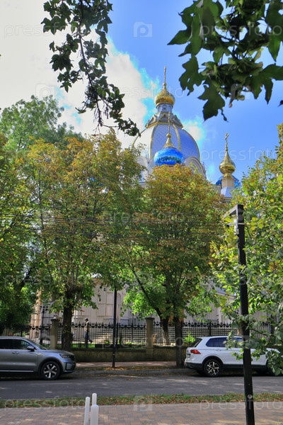 Храм с голубыми куполами и золотыми крестами. Вокруг растут деревья, стоят автомобили
