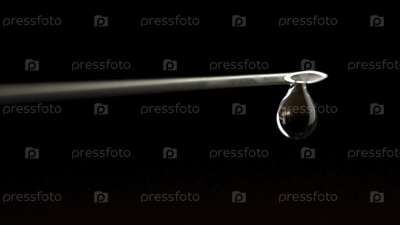 Крупный план иглы шприца с каплей лекарственного препарата на черном фоне. Крупный план шприца с каплей. Выборочная фокусировка на наконечнике
