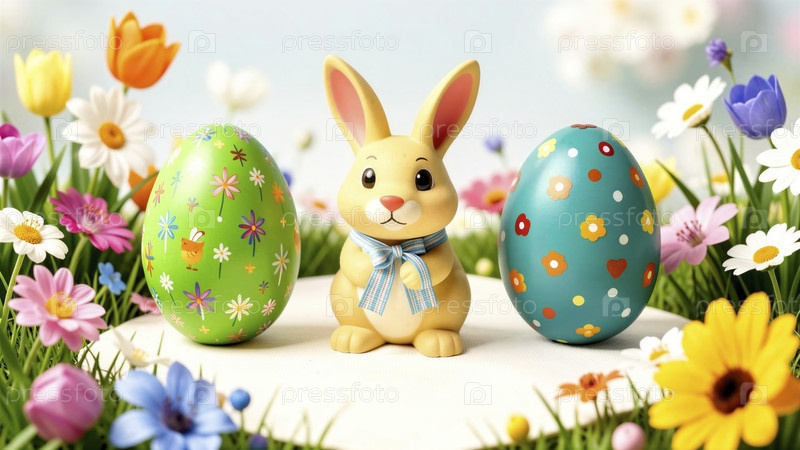 Пасхальный кролик с украшенными яйцами в цветочном саду