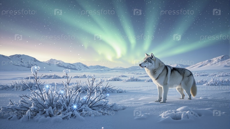 Хаски, стоящий в снежном зимнем ландшафте под северным сиянием, окруженный заснеженными горами и светящимися растениями ночью