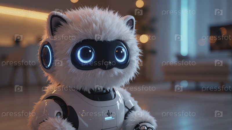 Очаровательный пушистый робот-кошка с голубыми глазами сидит в современном уютном домашнем интерьере