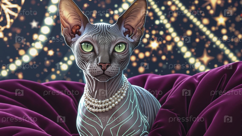 Кошка-сфинкс с элегантным жемчужным ожерельем, сидящая на богатом бордовом бархатном бархате перед сверкающими звездными огнями, роскошный портрет животного