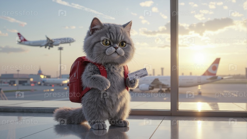Милый серый карикатурный кот с красным рюкзаком с посадочным талоном в аэропорту, самолетами и восходом солнца, видимым через большие окна