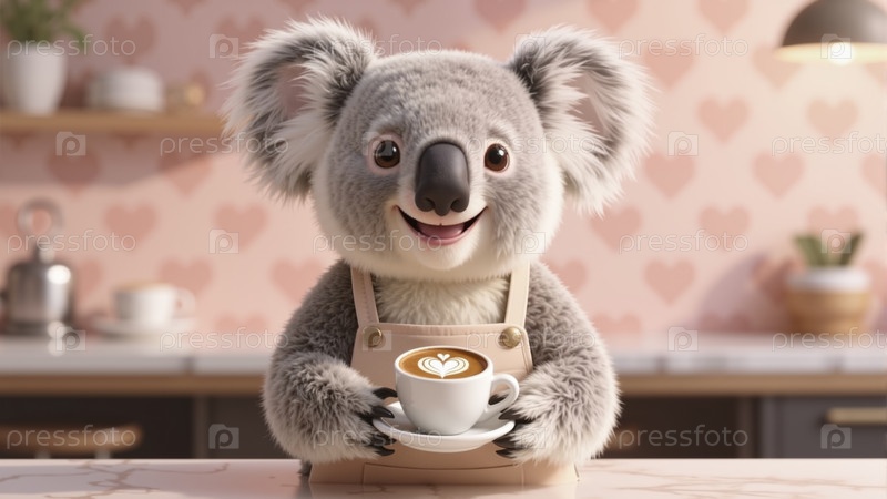 Мультфильм коала бариста в розовом фартуке с чашкой латте с искусством сердца в уютном кафе с обоями по образцу сердца