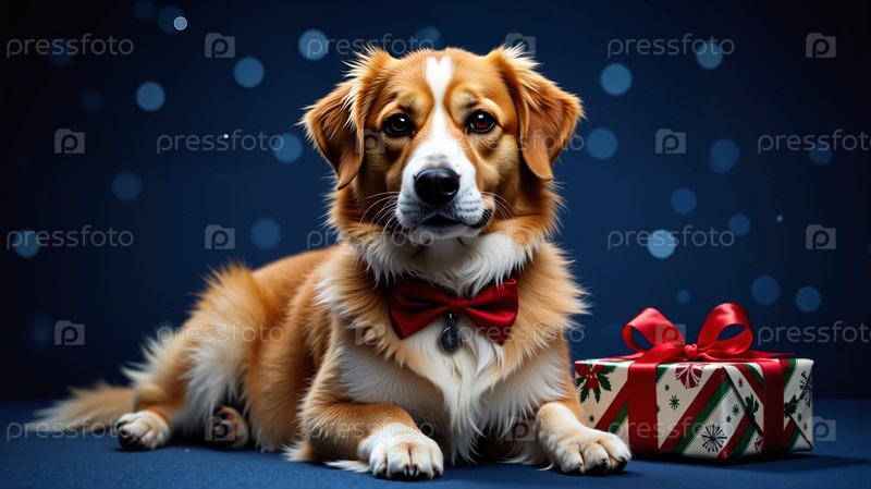 Праздничная собака с красным галстуком, лежащая рядом с рождественской подарочной коробкой на синем фоне студии боке