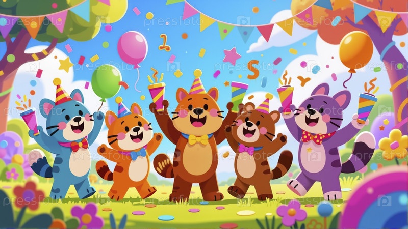 Пять красочных карикатурных кошек в праздничных шляпах и галстуках с луком празднуют с воздушными шарами и конфетти на открытом воздухе в яркий солнечный день