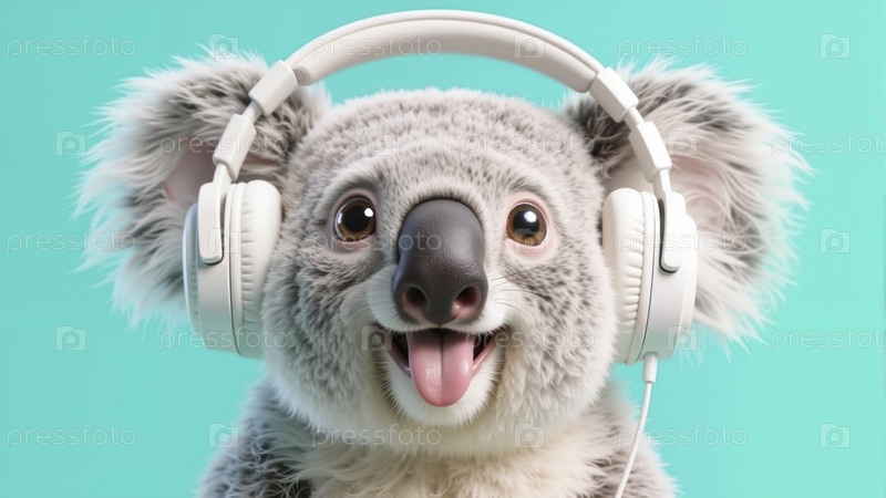 Мультфильм Коала слушает музыку с большими белыми наушниками на бирюзовом фоне, улыбаясь языком