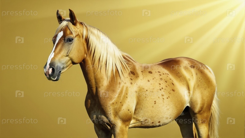 Портрет золотой паломинской лошади со светлой гривой, стоящей на сияющем желтом освещенном солнцем фоне