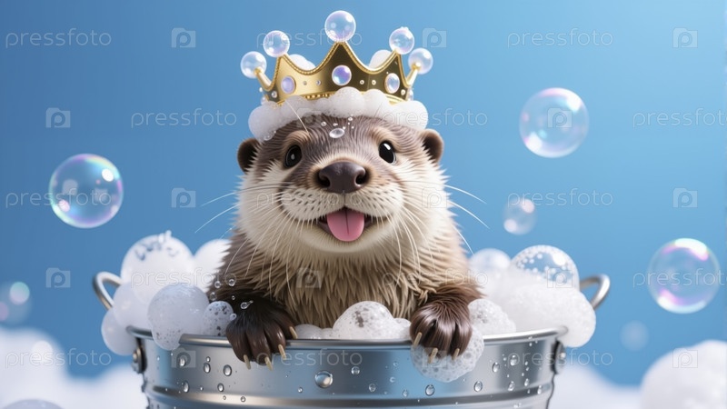 Милая карикатурная выдра с золотой короной и мыльными пузырями, принимающая ванну в металлической ванне на синем фоне