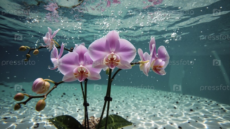 Нежные розовые орхидеи, цветущие под водой в прозрачной бирюзовой воде с пузырьками воздуха и песчаным морским дном