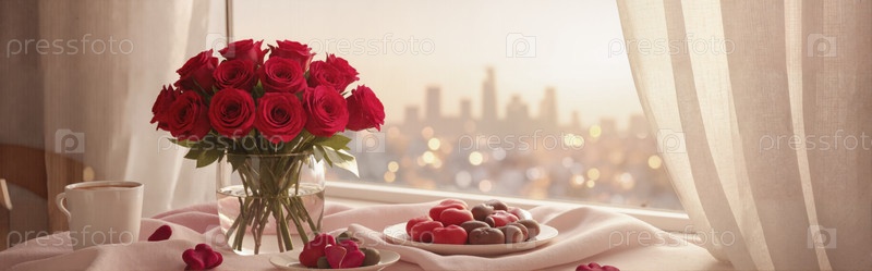 Красные розы и шоколад Городское окно
